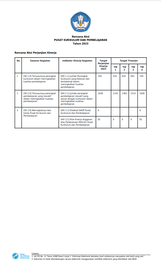 Rencana Aksi merupakan dokumen perencanaan Pusat Kurikulum dan Pembelajaran untuk satu tahun berisi program, Layanan umum, layanan perkantoran, bahan kebijakan kurikulum dan pembelajaran yang dikembangkan, kurikulum yang dikembangkan, perangkat pembelajaran yang dikembangkan, sistem informasi